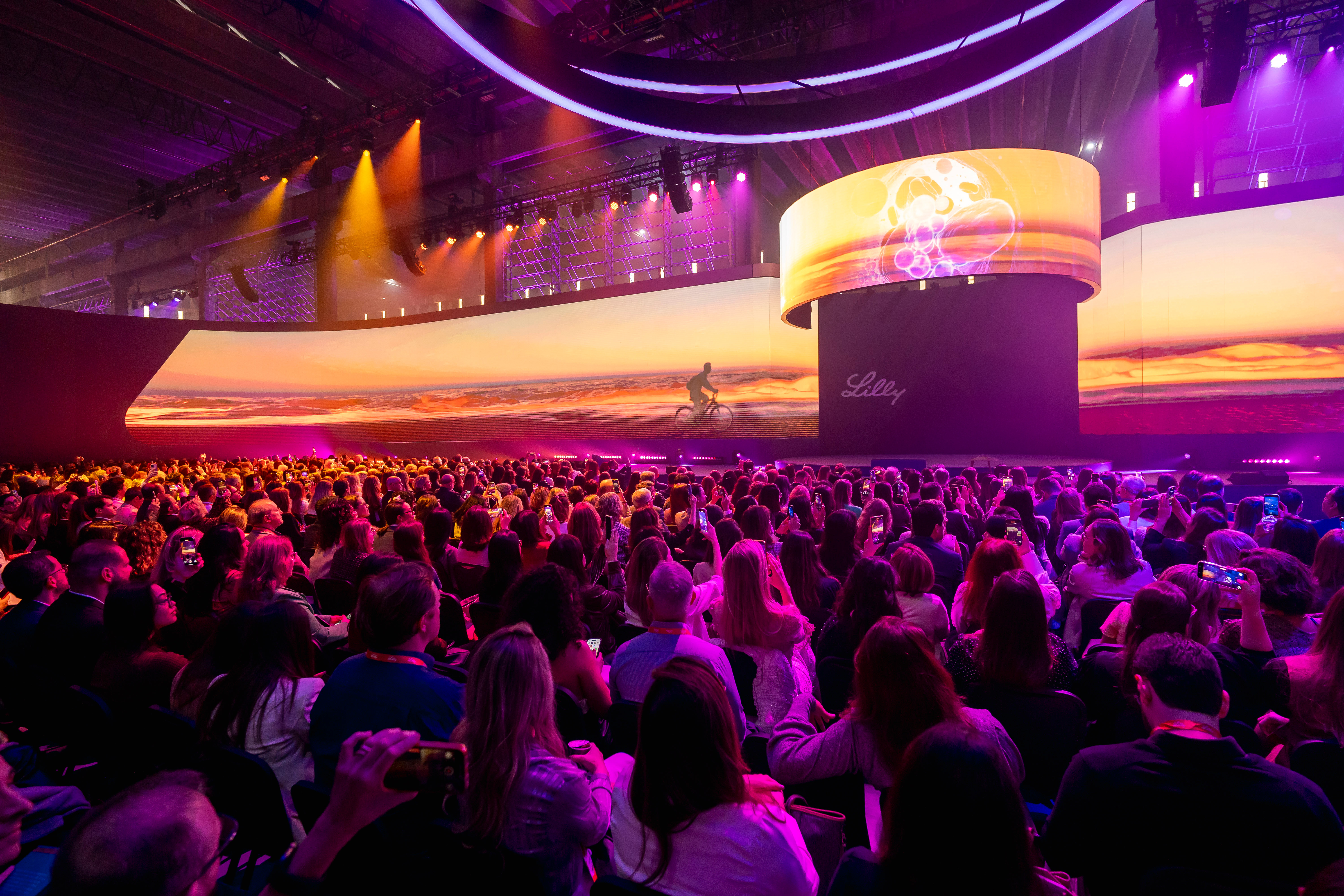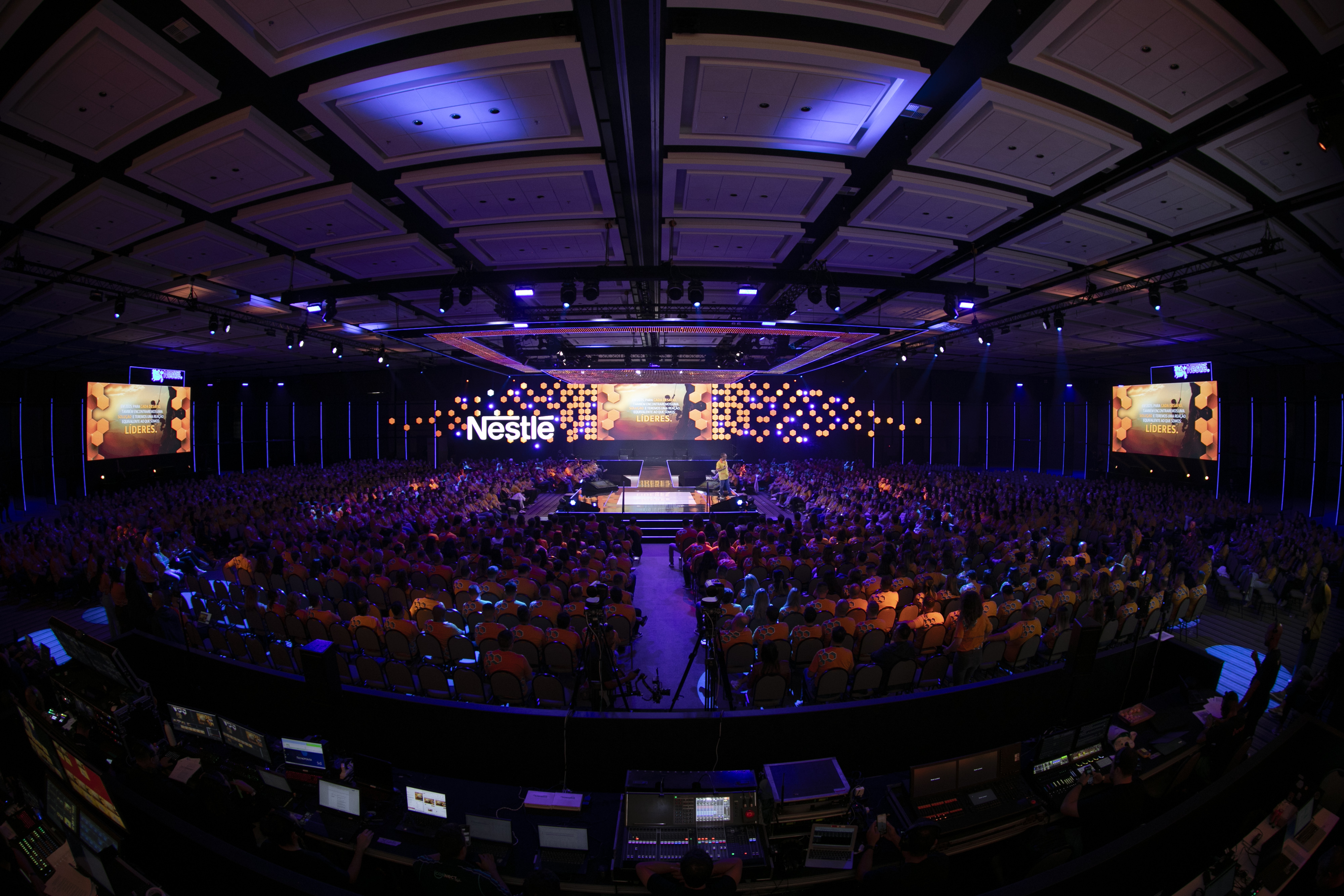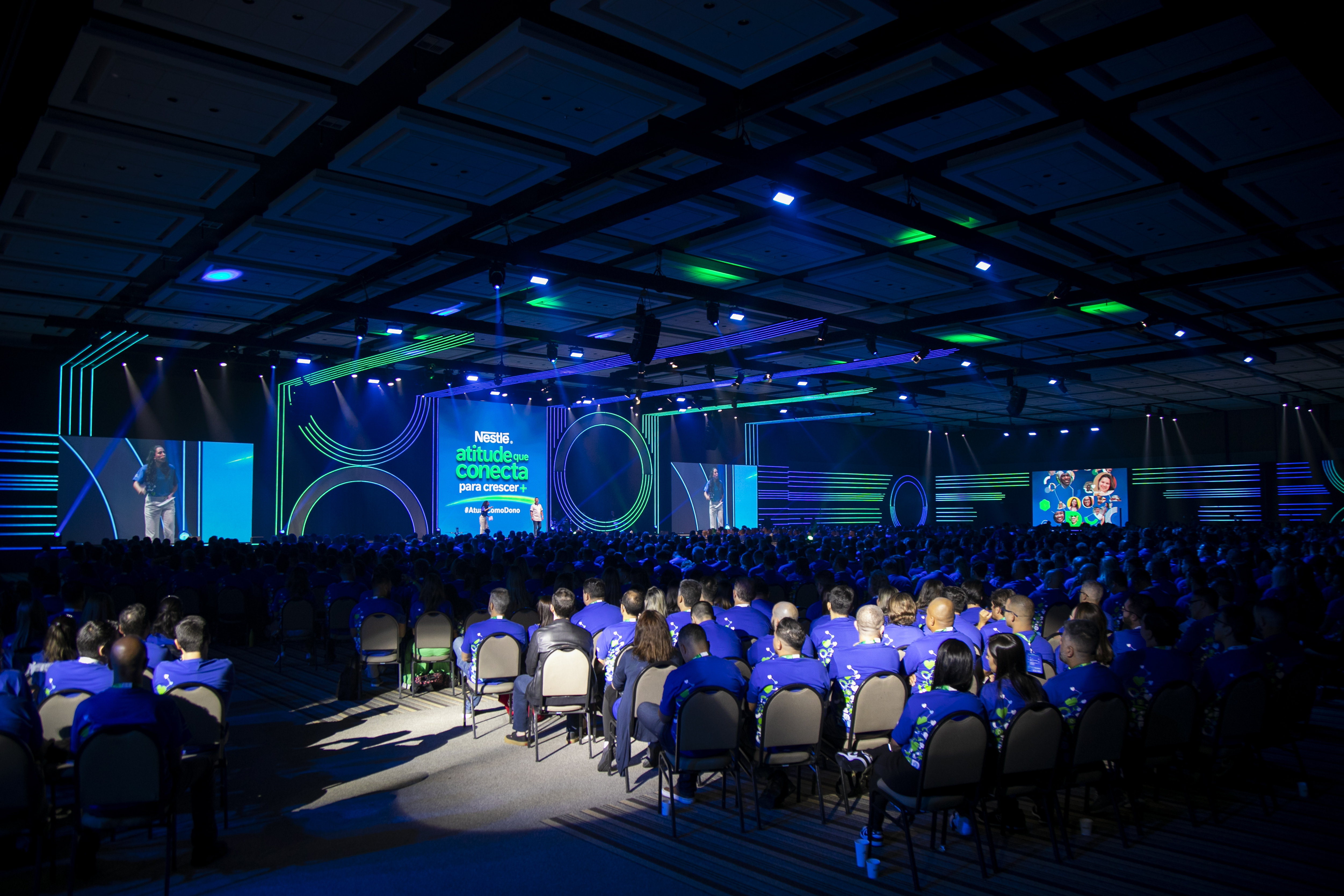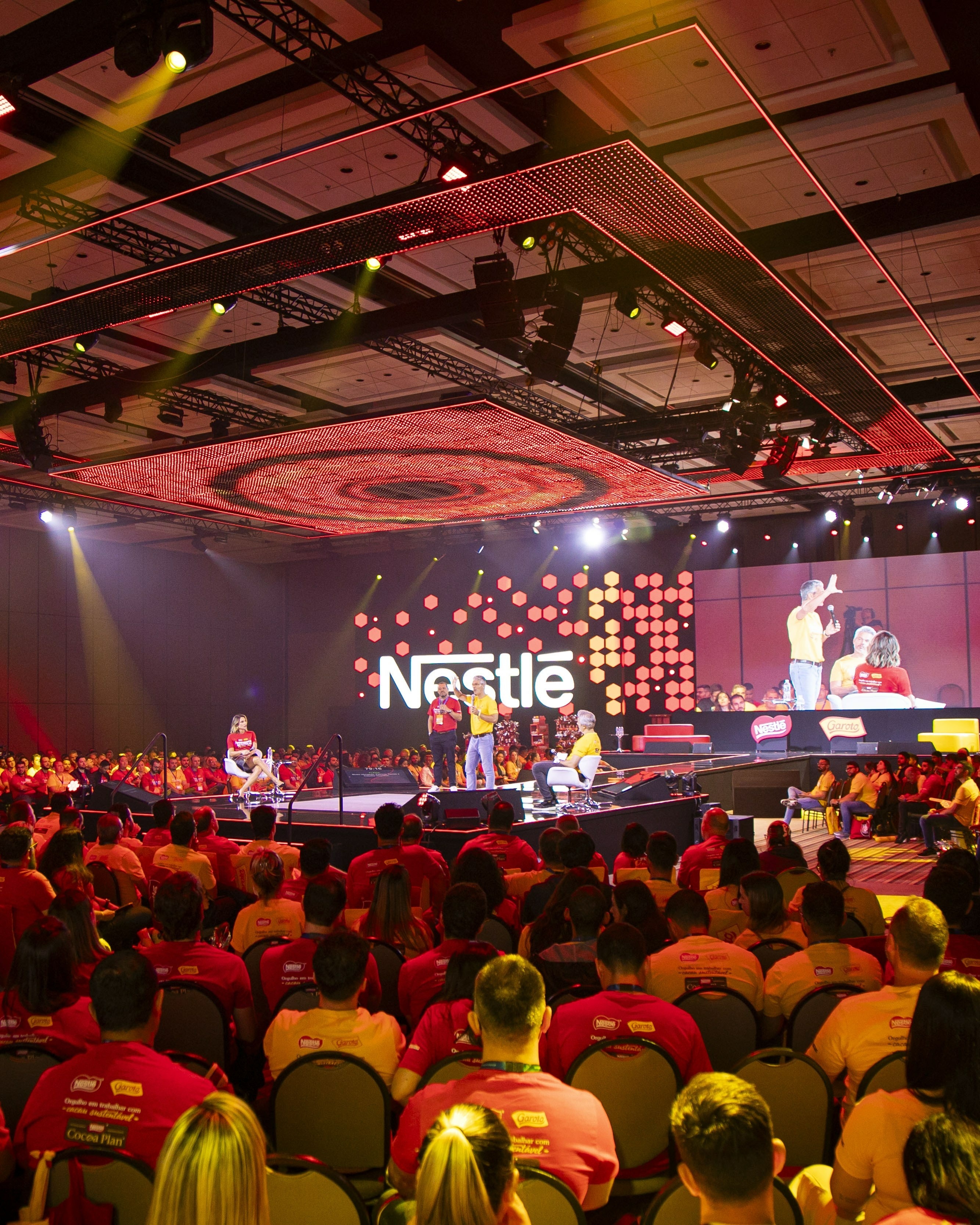 Em 2023, transformamos um único espaço em múltiplas plenárias independentes, adaptadas para cada área da Nestlé. A cenografia modular e as experiências simultâneas garantiram imersão total para mais de 6.500 participantes, presenciais e online.